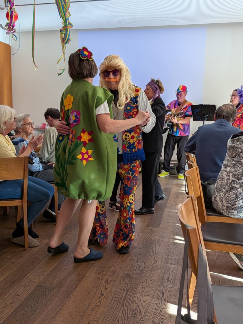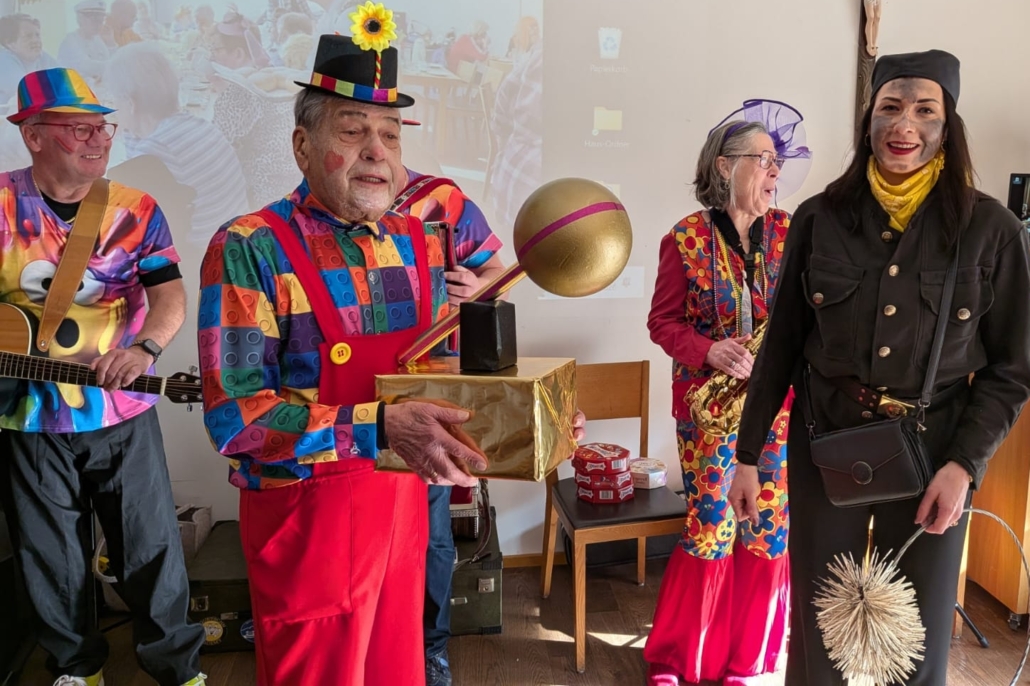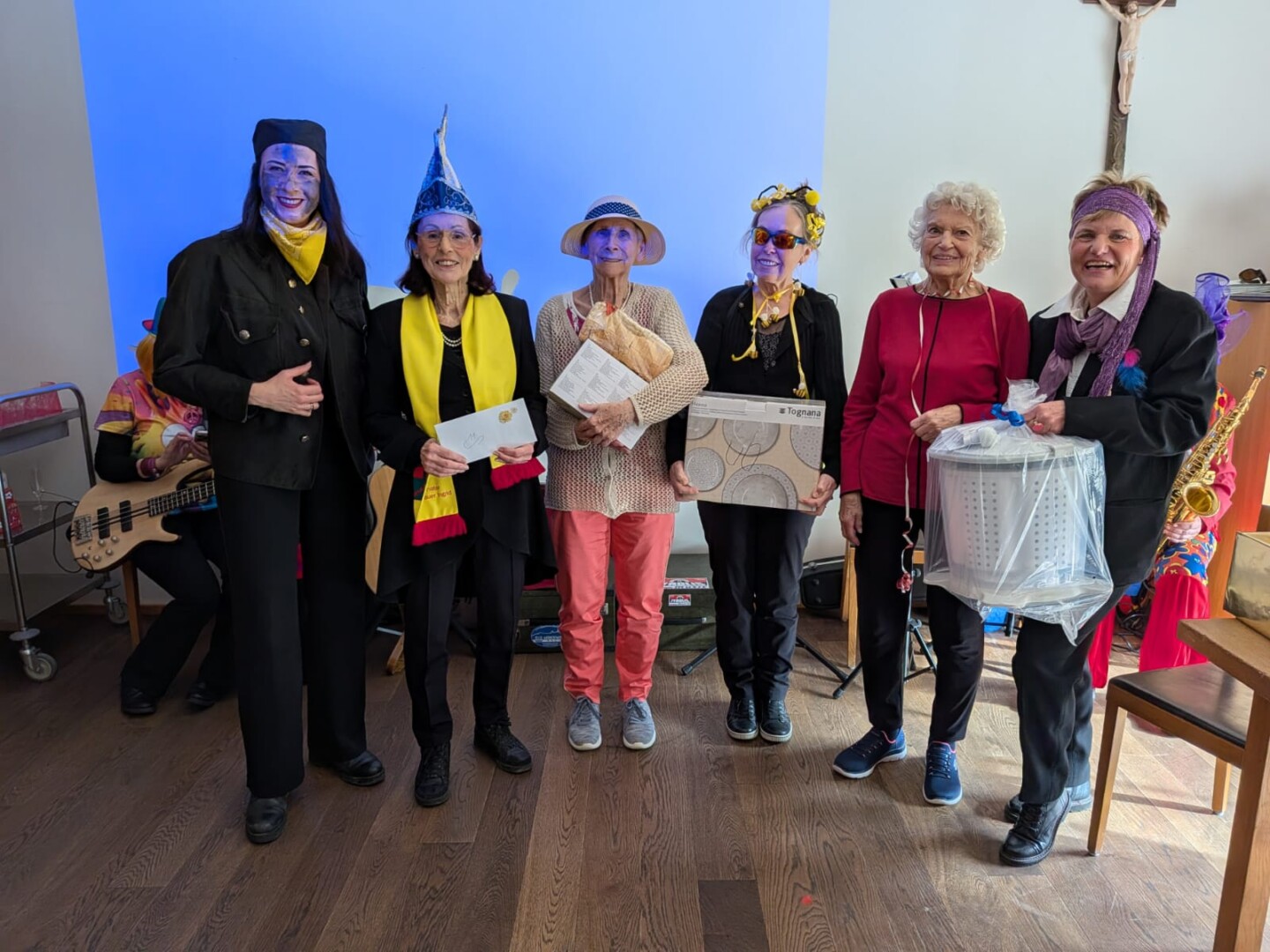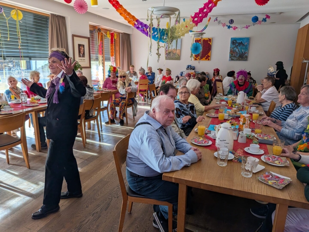 Heuer begrüßten die maskierten Bewohner:innen mit viel Applaus ihren Überraschungsstargast DAS ORIGINAL GR Walter Egger, um mit ihm gemeinsam eine kunterbunte Party zu feiern. Als großes DANKESCHÖN überreichte die Hausleitung Walter Egger das „Goldene Mikrofon“ für all seine Einsätze in den letzten 15 Jahren. Die MIA 3 sorgten mit ihrem bunten Musikprogramm für eine „mords Stimmung“. Es wurde viel gesungen, geklatscht, getanzt und bei der Polonaise marschierten alle mit.