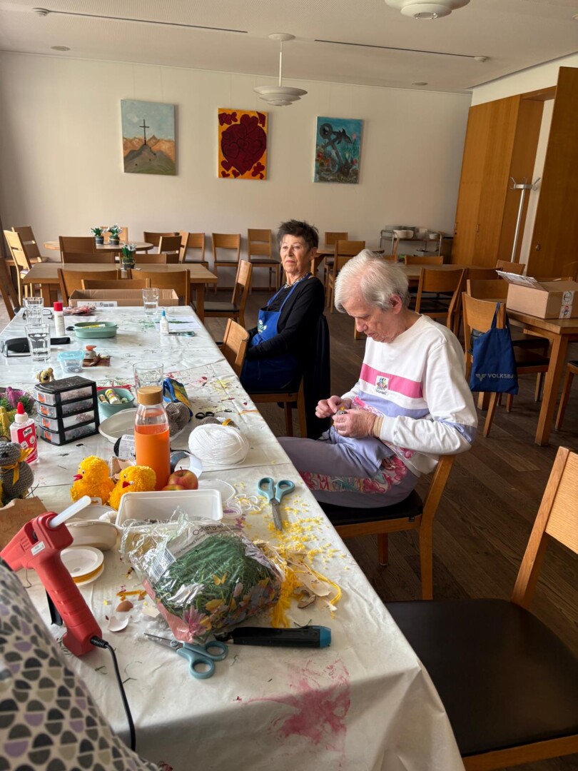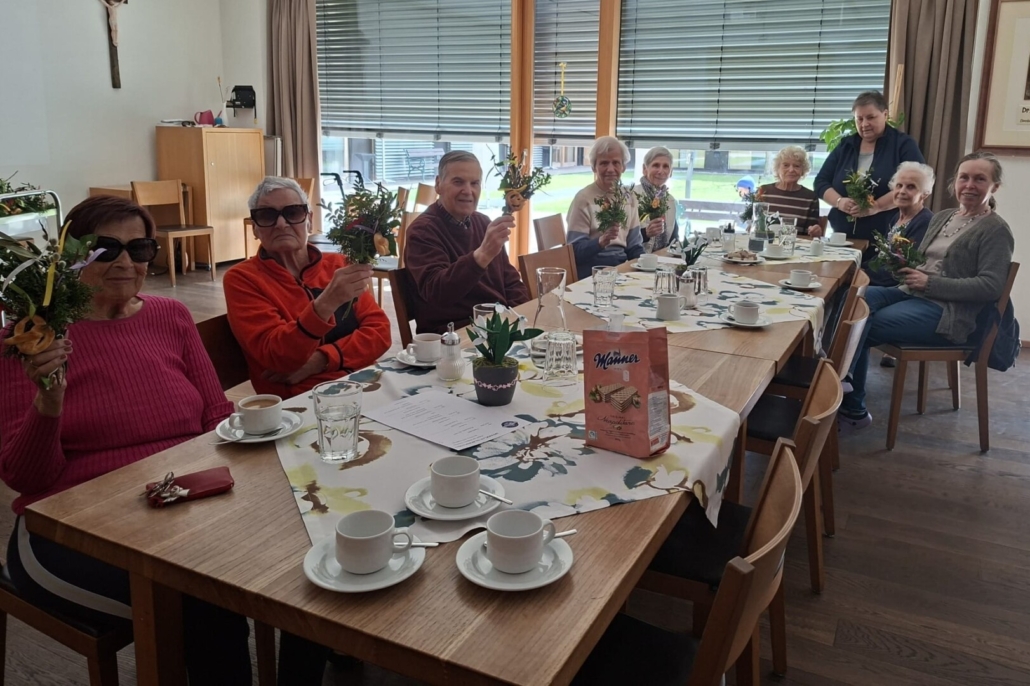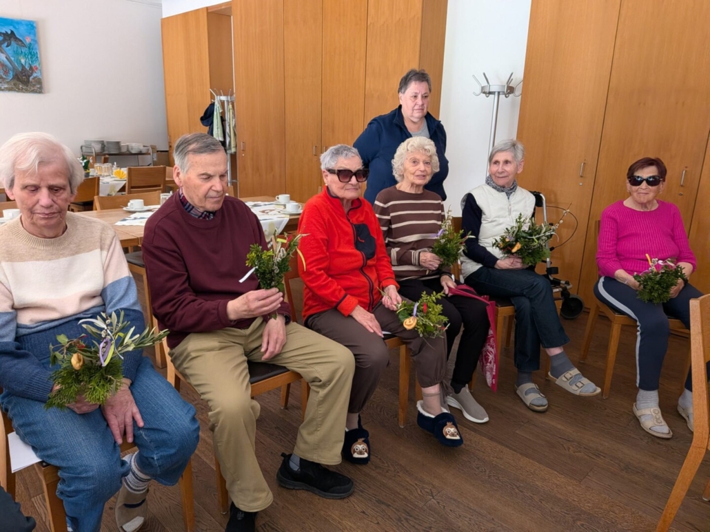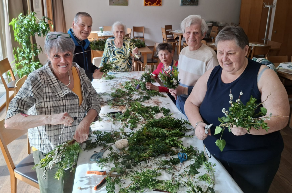 Die Bastelgruppe bastelt schon seit geraumer Zeit jeden Mittwoch Nachmittag mit viel Eifer und Begeisterung an der Osterdekoration für das gemeinsame große Osterfrühstück. Alle sind schon sehr gespannt, wie schön heuer die Tische dekoriert werden. Auch dieses Jahr hat die Bastelgruppe Palmsträußchen für alle Bewohner:innen vom Haus selbst gebunden. Drei Bewohner:innen haben die dazu gehörigen Palmbrezeln selbst gebacken.